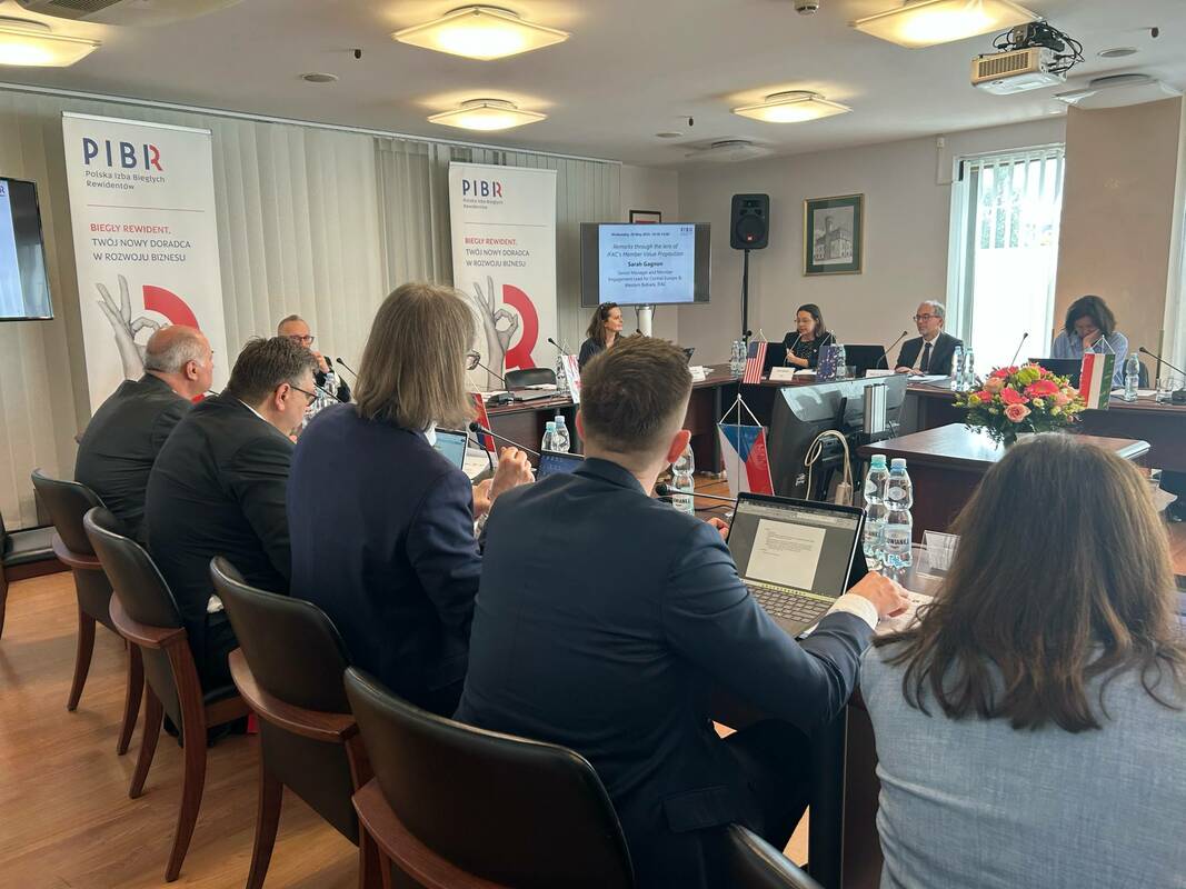 Po wystąpieniach gości z międzynarodowych organizacji rozpoczęła się sesja na temat współpracy z krajowymi organami nadzoru publicznego oraz doświadczeń w zakresie kontroli jakości. W Czechach, na Słowacji i na Węgrzech nadzór nad wykonywaniem badań jest podzielony pomiędzy izbę (badania nie-JZP) a organ nadzoru (badania JZP). Rozmawiano o przebiegu kontroli w poszczególnych krajach, obszerności przekazywanej dokumentacji, systemie sankcji i skalowalności. W toku dyskusji okazało się, że tylko w Polsce cała dokumentacja dotycząca systemu musi być prowadzona w języku polskim, w pozostałych krajach V4 możliwy jest język angielski. Nie ma też potrzeby przekazywania organowi całości sprawdzanej dokumentacji badania i to w dodatku przetłumaczonej na język krajowy. Na Słowacji kontrola jest prowadzona w siedzibie firmy, w Czechach najpierw na miejscu, a kontynuowana zdalnie, natomiast na Węgrzech przyjęte są obydwa warianty, w zależności od preferencji firmy. Co ważne, we wszystkich 3 krajach kluczowe spotkania odbywają się w siedzibie firmy. Przedstawiciele izb goszczący w siedzibie PIBR ocenili, że w Polsce zakres potrzebnych organowi do kontroli danych i informacji, język dokumentacji, forma wykonywania kontroli oraz sam system dochodzeń i sankcji jest najmniej przyjazny dla firm i biegłych.