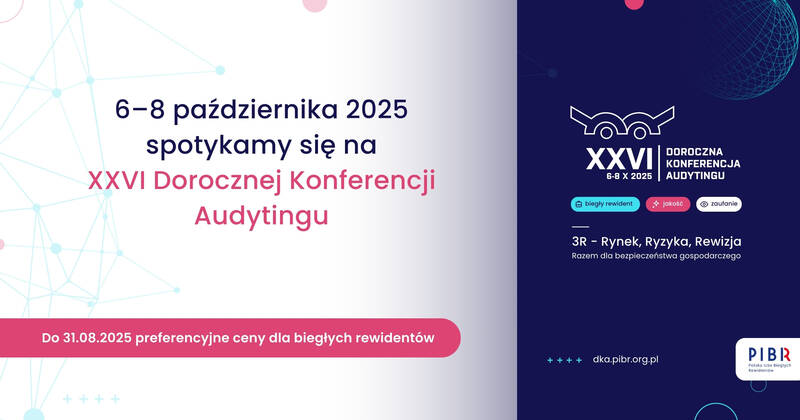 Przypominamy, że promocyjne stawki dla biegłych rewidentów dostępne są tylko do 31 sierpnia br. – po tym terminie obowiązywać będzie cena podstawowa, zarówno na udział stacjonarny, jak i online. Zachęcamy do zapoznania się z programem XXVI DKA i do udziału w konferencji.