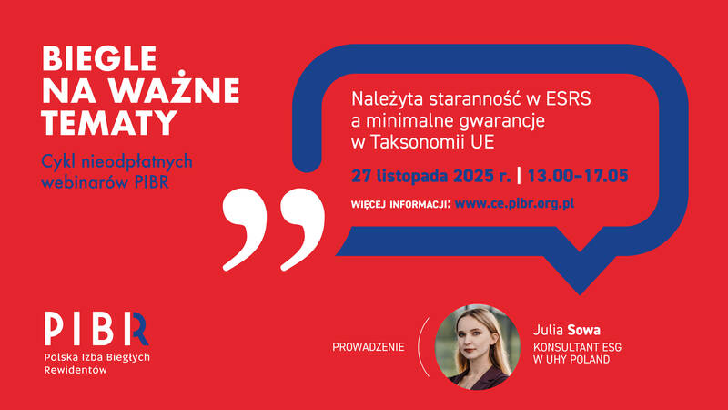 27 listopada w godz: 13:00 – 17:05 obędzie się kolejny webinar PIBR z cyklu „Biegle na ważne tematy”. Tematem spotkania będzie: „Należyta staranność w ESRS a minimalne gwarancje w Taksonomii UE”. Rejestrację prowadzi Centrum Edukacji PIBR. Zachęcamy do udziału!