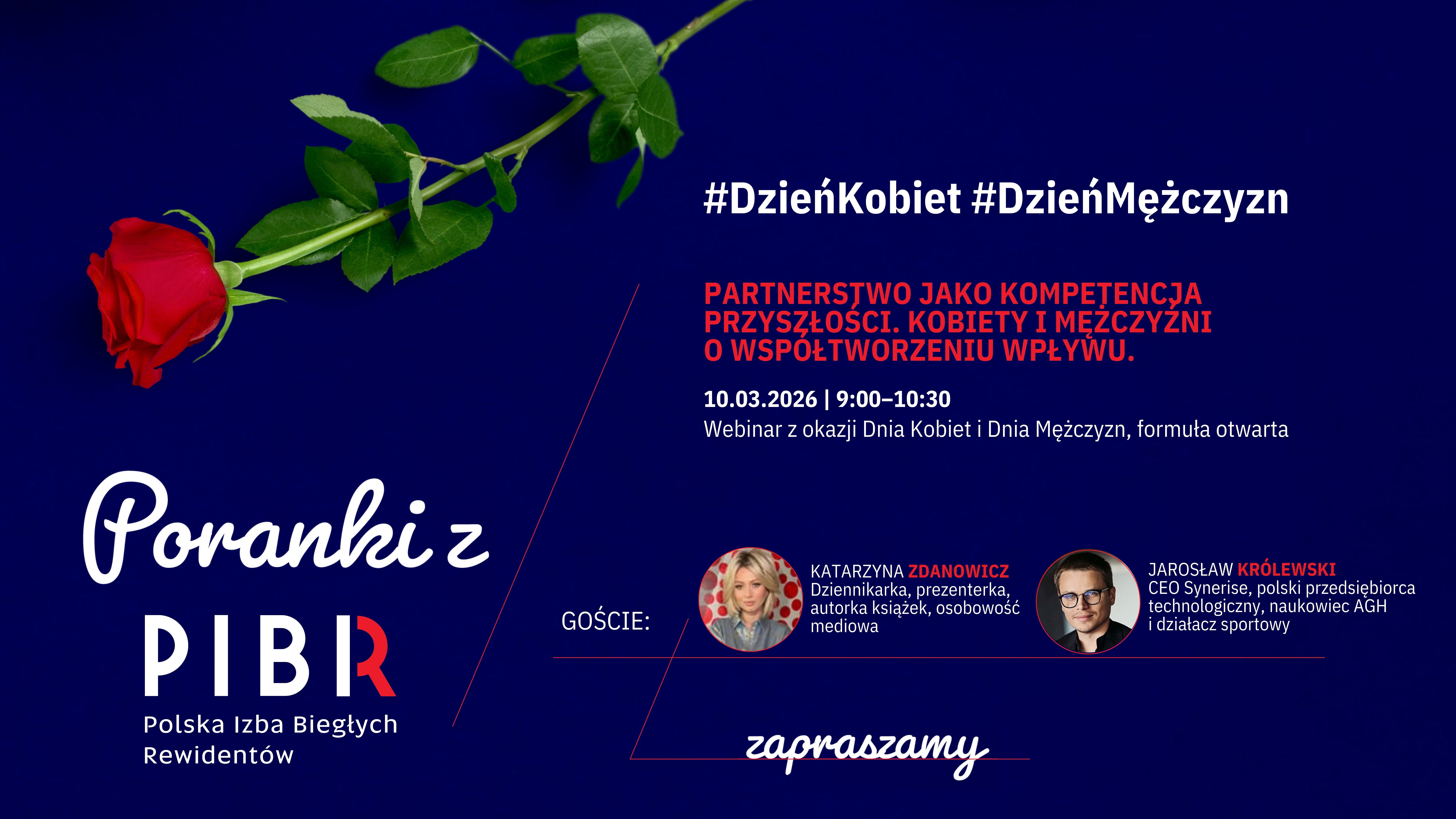 Zapraszamy na wydanie specjalne „Poranka z PIBR”, podczas którego porozmawiamy o partnerstwie jako kompetencji przyszłości, o współtworzeniu wpływu przez kobiety i mężczyzn w biznesie, technologii i zawodach zaufania publicznego.